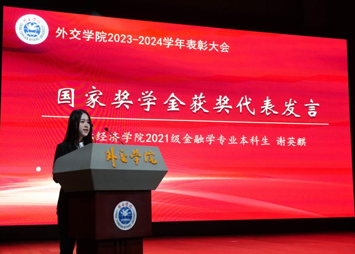 2023-2024学年国家奖学金获得者国际经济学院2021级本科生谢英麒代表全体获奖同学发言,她表示作为新时代的青年,不仅要“知世界”,更要“讲中国”,站稳中国立场,用语言架桥,用文化聚心,用才智铺路,让世界听到中国最嘹亮的声音。