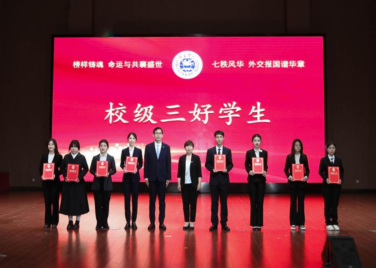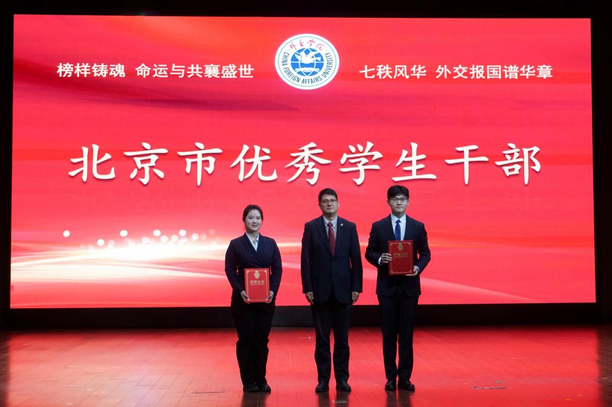 外交学与外事管理系党总支书记张静、院长办公室主任阚四进为“校级三好学生”获奖代表颁发荣誉证书