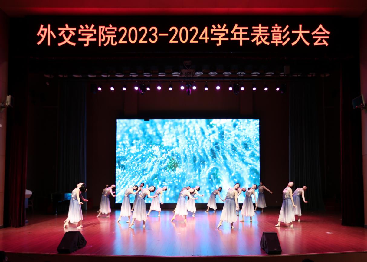 本次主题教育活动播放了2023-2024学年获奖学生集锦的暖场视频,布置了国家奖学金获奖学生的事迹展板,生动呈现了过去一年外院学子在“铸魂工程”引领下的成长风貌,激励同学们以榜样铸魂,砥砺奋进,为中国特色大国外交贡献青年智慧与青年力量。团委学生会的同学们通过舞蹈、朗诵等艺术化表现形式庆贺外院70载岁月风华,表达了对祖国、对理想、对榜样的拳拳真心。