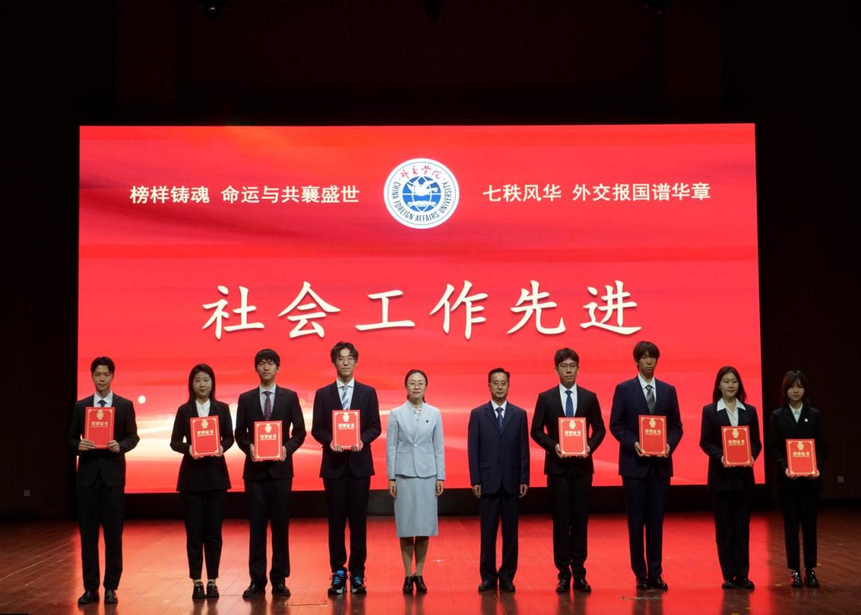国际法系党总支书记王胜乾、外事办公室主任马新宇为“社会工作先进”获奖代表颁发荣誉证书