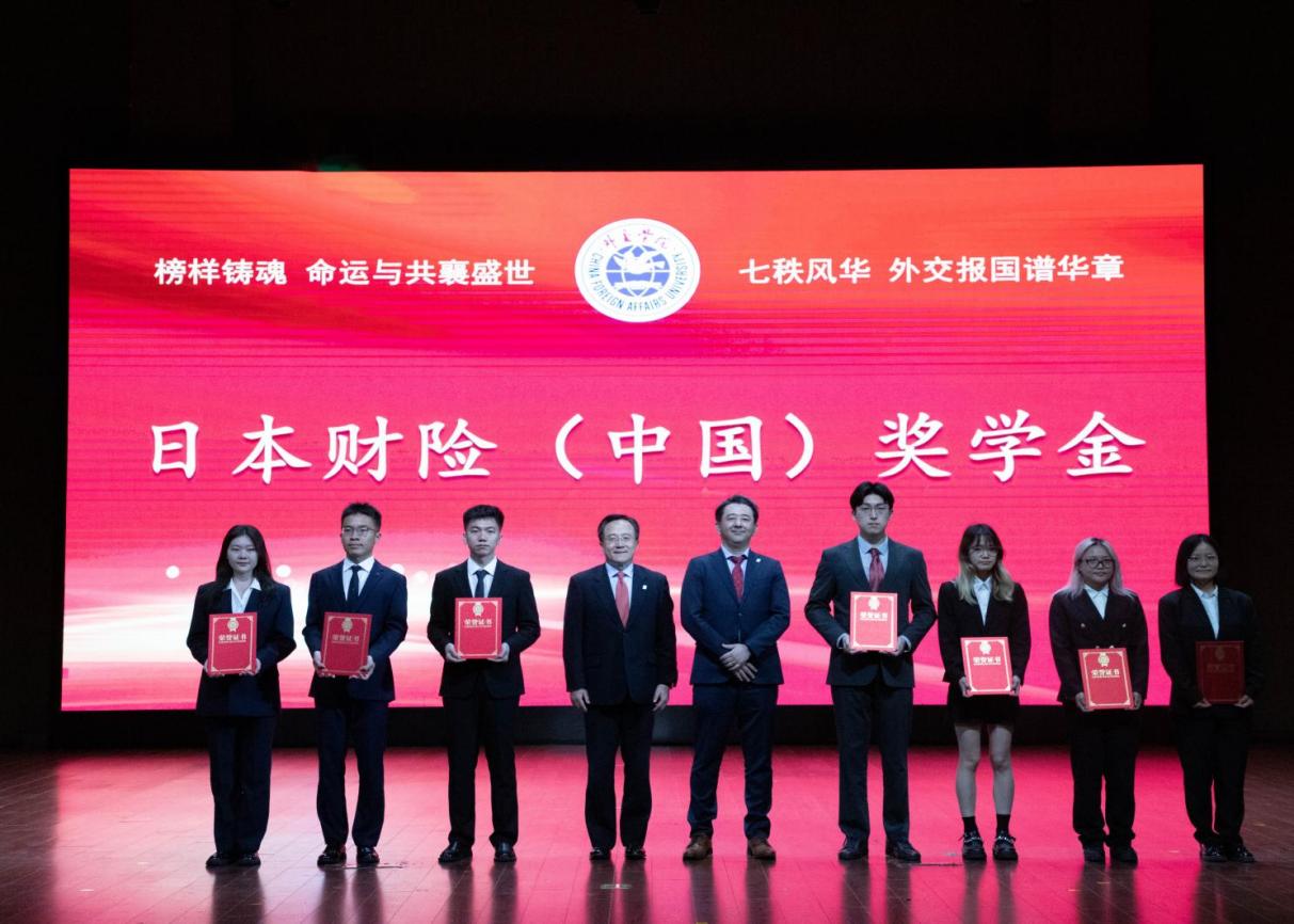 日本财产保险(中国)有限公司副董事长、总经理松尾俊哉、董事副总经理田嘉铭为“日本财险(中国)奖学金”获奖代表颁发荣誉证书
